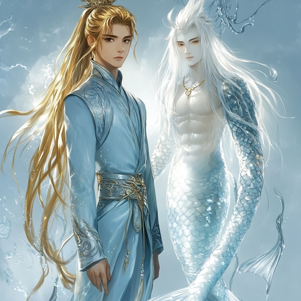 Создано на основе запроса: Chinese fantasy novel cover design. On the cover is a tall young man with long golden hair tied in a high ponytail, wearing a light blue rich outfit. The second character is a mermaid man with long white hair, the mermaid's scales and tail are pearlescent and white. Mysterious atmosphere. --- Автоперевод: Китайский фэнтезийный роман дизайн обложки. Какое твое впечатление? 🤔 https://dzen.ru/id/65c0c65c86e4f837c27b24d7 #ИИ #AI #нейросеть #midjourney #art