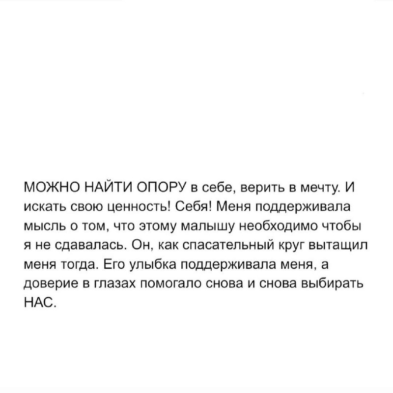 Я стояла и смотрела как под окном человек пятьдесят с шампанским, охапками цветов поздравляют мою соседку по больничному боксу. Две палаты, один туалет - в роддоме… На моих руках тихо сопел мальчик с глазами старца… Мне неловко было с ним сюсюкать, настолько мудрый и осознанный взгляд был у этого крохи…. ⠀ Люди кричали поздравления, запускали шары в небо, а мне хотелось выть от жалости к себе. ⠀ Ко мне никто не приходил. ⠀ И не поздравлял. ⠀ Потому что мы с сыном были абсолютно одни. ⠀ Семь месяцев борьбы с тем, чтобы не сдаться. Чтобы верить в себя. В свои мечты… Отец крохи оставил меня на втором месяце беременности. Мамы уже не было, сестры жили своей жизнью, из которой я - была исключена. Ведь в системе семьи я для них - “плохая мама” - та, которая орала, заставляла, шпыняла… ⠀ Мне пришлось вернуться из Питера в мой город Ангарск. Предать мечту и ощущать за спиной смешки и перешептывания - “Довы.. еживалась! Приехала с пузом - столицу она решила покорить!” ⠀ Я рвала простыни на пел