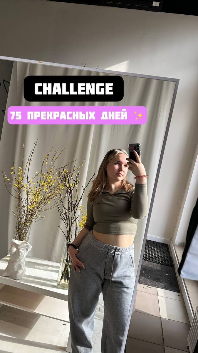 Наверно, вы уже видели в интернете этот челлендж ❤️ И мне тоже стало интересно попробовать особенно перед летом ☺️ Увидела про него у Насти бэдбарби и тоже захотелось попробовать 🥹 НО ПЕРЕД ЭТИМ ХОЧУ СКАЗАТЬ, что с завтрашнего дня (уже сегодня😅) я НАЧИНАЮ🚀 Я буду по максимуму показывать, как у меня получается или нет😏😏😏 все будет под хештегом #75дней 💕75 ПРЕКРАСНЫХ ДНЕЙ💪 Что делаем? 1. Берем стикеры, нумеруем их на 75 дней и приклеиваем на видное место, чтобы каждый продуктивно прожитый день срывать и хвалить себя ахах🗒 2. Делаем замеры 🤏 Пишем в заметках сколько см талия, ляшки, попа, руки! Снимаем себя со всех сторон и взвешиваемся! 3. Каждый день встаем рано, я решила вставать в 7 утра ☀️ 4. Пьём 2 литра воды в день 🤩 5. Читаем по 15 страниц, выбираем любую книгу 📓 6. Занимаемся спортом 1,5 часа в день (я решила, что 30 минут спорта дома и 1 час ходьбы примерно 12 тысяч шагов) ✍️ 7. Правильно питаемся , отказываемся от фастфуда 🍟🍔🍕 ВСЕ! Звучит не так уж и с