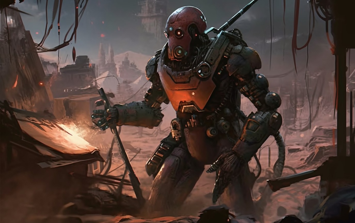 Создано на основе запроса: this figure in a ruined city on a desert planet hacking a data terminal, the data terminal is small but on a stand and in view, close up, dramatic lighting, in the style of john blanche, painterly