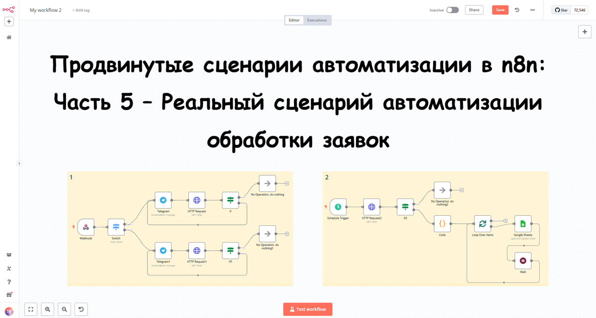 В этом разделе разберём сложный сценарий, состоящий из двух независимых воркфлоу: