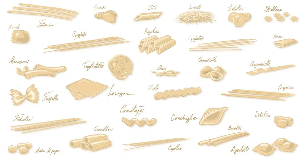Самому старому рецепту пасты почти тысяча лет, и он очень прост: это что-то типа лапши с сыром и перцем. Я не знаю точно, сколько видов пасты существует сейчас, но никак не меньше сотни. Из них три десятка — самые популярные и ходовые.