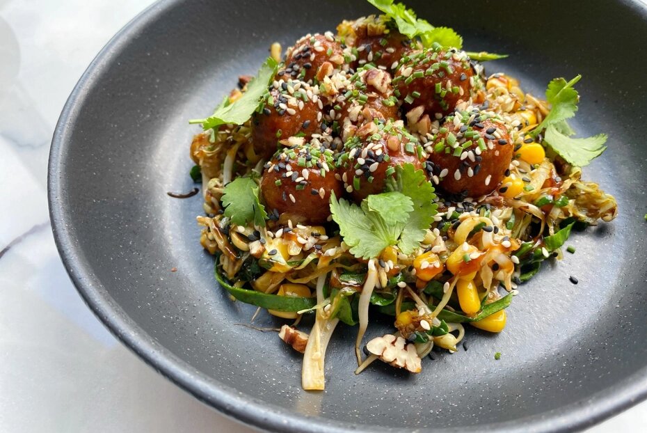 Яркий рецепт, где обе составляющих эффектней некуда: фалафель с большим количеством специй и капустная лапша, которая может выступать как самостоятельное блюдо. Рецепт шеф-повара ресторана Archie Виктора Массова. 1.Замочить нут на ночь. 2.Пропустить нут и лук через мясорубку, добавить мелконарезанные перец, чеснок и кинзу. 3.Выложить в глубокую миску, добавить карри, зиру, соль, муку и тщательно перемешать. 4.Сформировать шарики по 10–15 грамм, обвалять их в муке и обжарить во фритюре 3 минуты. 5.Капусту нарезать тонкой длинной соломкой. На сильно разогретую сковороду вылить немного кунжутного масла и быстро обжарить капусту. В процессе добавить ростки, кукурузу, соевый соус и хорошо перемешать. 6.Соус тонкацу и томаты соединить в сотейнике и уварить на треть. В готовый соус выложите фалафель и прогреть 1 минуту. 7.В тарелку перед подачей к столу выложить капусту, в центр — фалафель, украсить листиками кинзы и кунжутом. Понравился рецепт — поделитесь им с друзьями в социальных сетях!