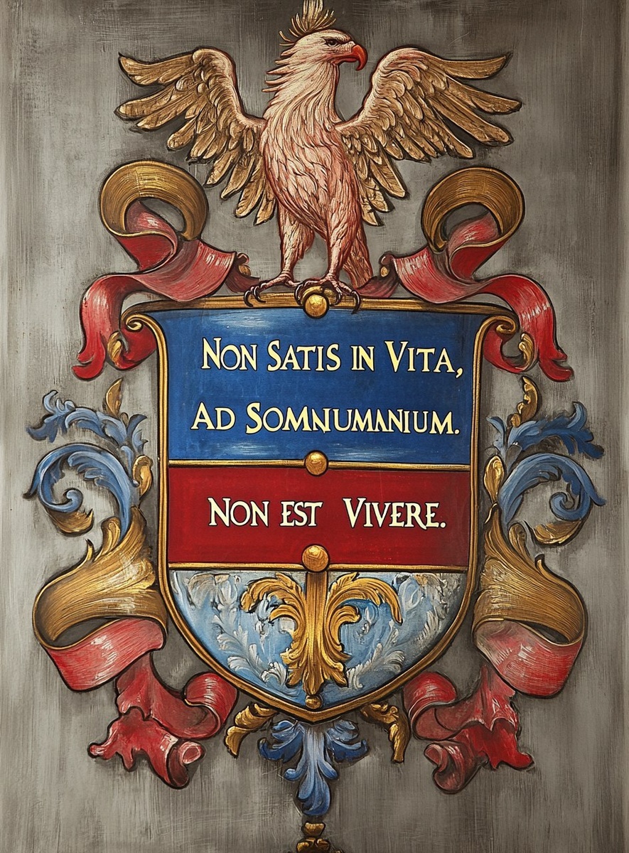 Создано на основе запроса: coat of arms with text " NON SATIS IN VITA, AD SOMNIUM. NON EST VIVERE." in the middle, red white and blue colors, grey background, family crest style coat of arm made by old medieval glass window, the top is a majestic eagle with wings spread open , there's two small dots on each side of it, the rest part of emblem has three horizontal golden stripeses