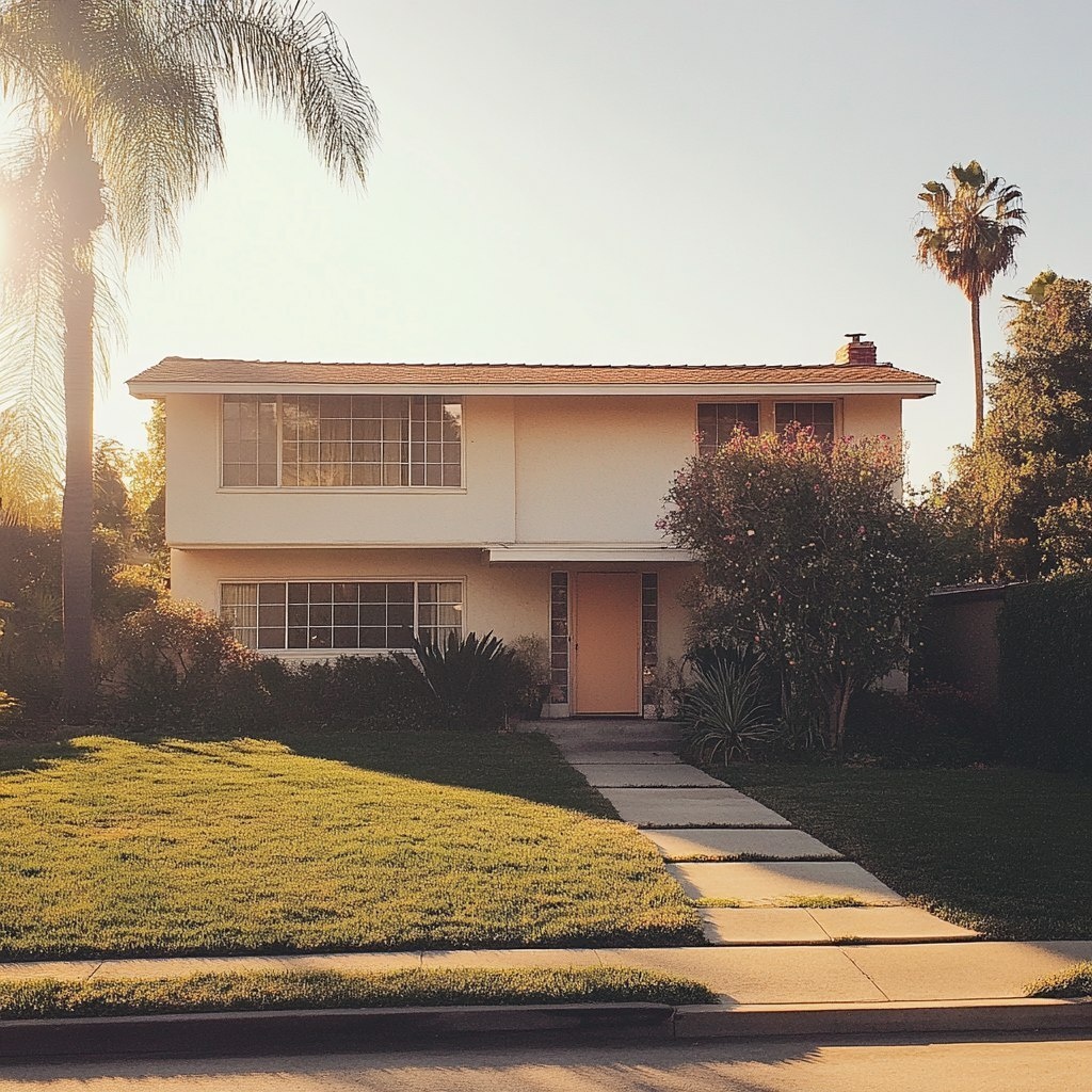 Создано на основе запроса: 1980’s suburban home in Los Angeles with a front door and 4 windows the sun is shining beautifully on the home