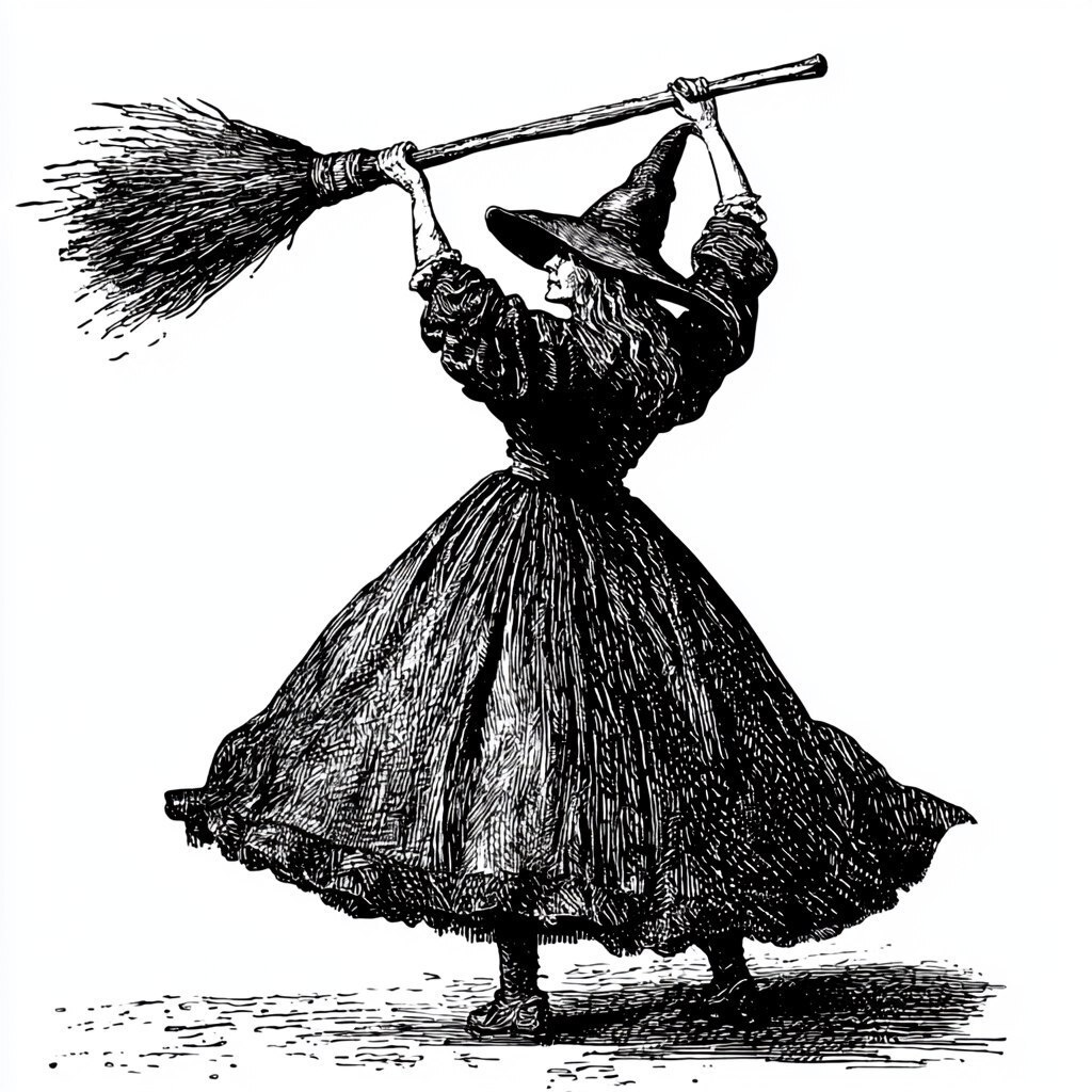 Создано на основе запроса: witch with besom lifting it above the head with both arms, old book illustration, illustration, victorian style, white background