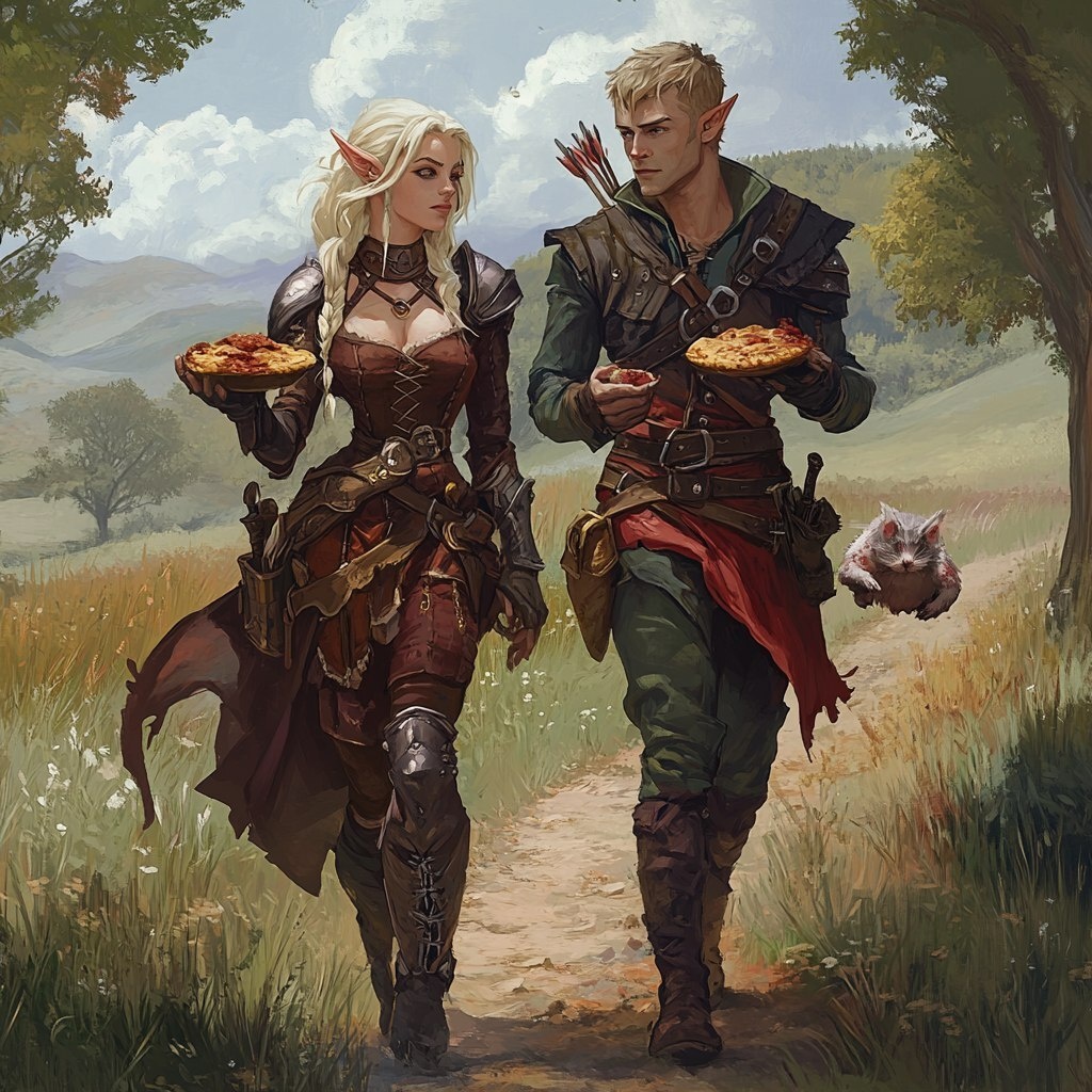 Создано на основе запроса: in the style of dungeons and dragons, a burned and a male blonde elf sorcerer and a ratling rogue walk through a field eating meat pies --- Автоперевод: В стиле подземелий и драконов, сгоревших и мужского блондинного колдуна эльфа и рога Необычно вышло? 🤔 https://dzen.ru/id/65c0c65c86e4f837c27b24d7 #ИИ #AI #нейросеть #midjourney #art