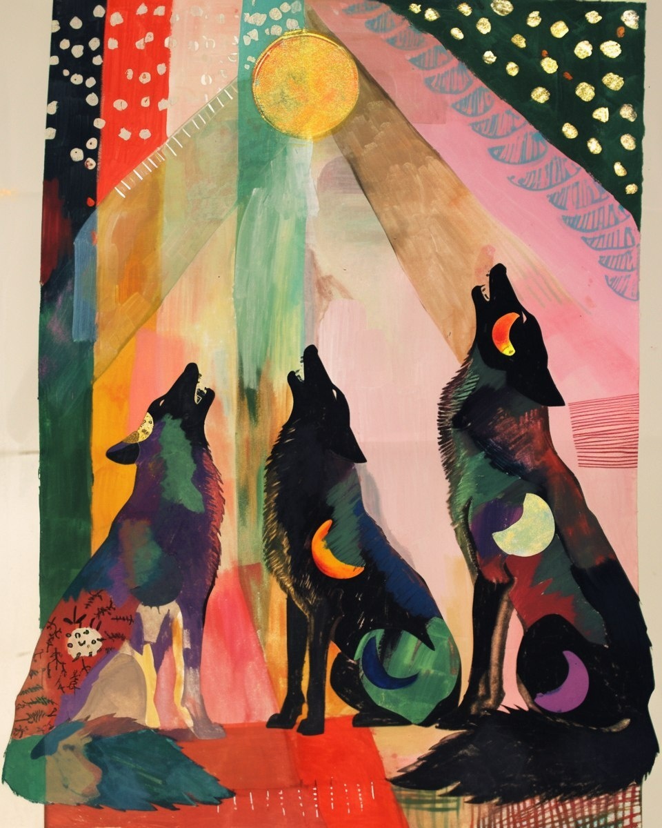 Создано на основе запроса: Wolves howling at the moon majestic, hypnagogic maximalism physicsbased paper collage, in the style of suburban