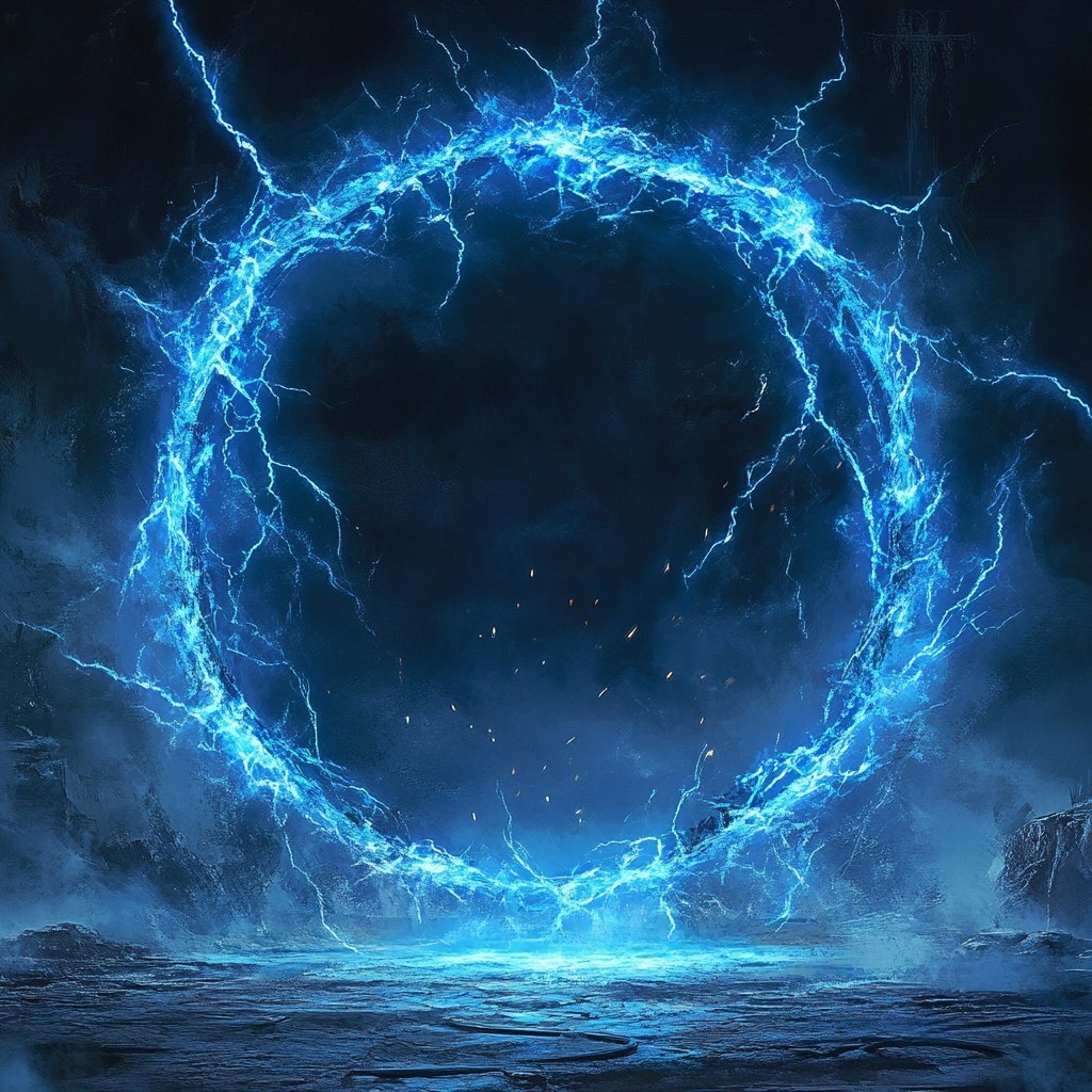 Создано на основе запроса: A mystical portal of blue energy hovers in the air, with pulsating circular edges and arcane glowing details
