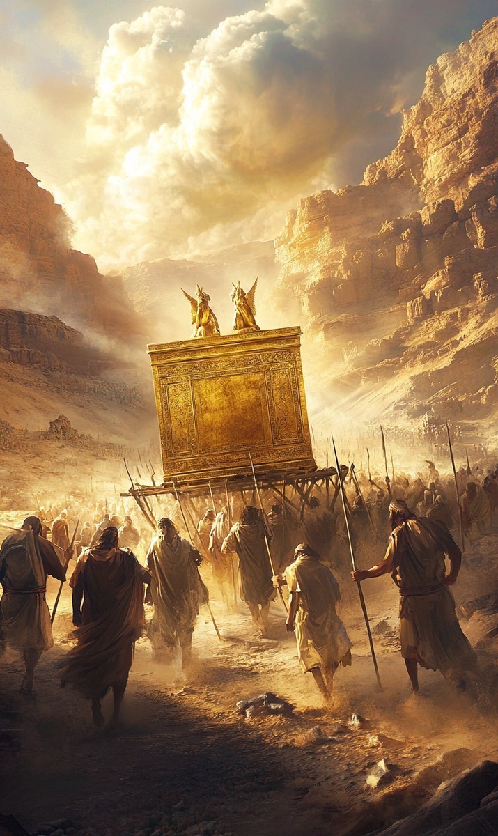 Создано на основе запроса: A dramatic scene of ancient Israelites walking through the desert, carrying the Ark of the Covenant on their