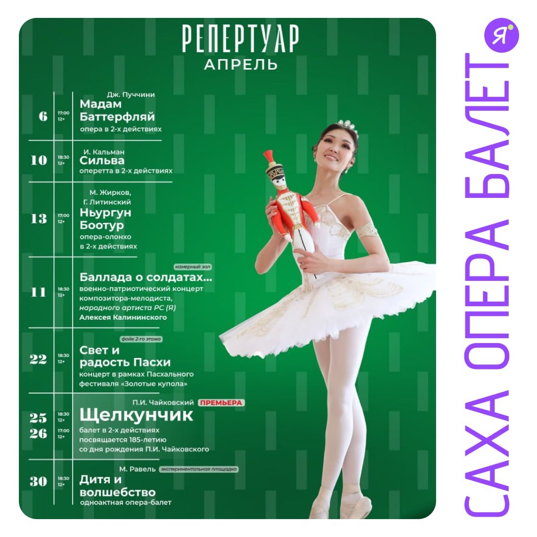 Репертуар Театра Оперы и Балета на апрель #ВТеатре 6 апреля | 17:00 Дж. Пуччини «Мадам Баттерфляй», опера в 2-х действиях. 12+ 300-2000 руб. 10 апреля | 18:30 И. Кальман «Сильва», оперетта в 2-х действиях. 12+ 300-2000 руб. 11 апреля | 18:30 «Баллада о солдатах» военно-патриотический концерт композитора-мелодиста, народного артиста РС (Я) Алексея Калининского, камерный концерт. 12+ 400 руб. 13 апреля | 17:00 М. Жирков, Г. Литинский «Ньургун Боотур», опера-олонхо в 2-х действиях. 12+ 400 руб. 22 апреля | 18:30 «Свет и радость Пасхи» концерт в рамках Пасхального фестиваля «Золотые купола», фойе 2-го этажа. 12+ Свободный вход и рассадка 25 апреля | 18:30 26 апреля | 17:00 ПРЕМЬЕРА - П.И. Чайковский «Щелкунчик», балет в 2-х действиях. 0+ 1000-3000 руб. 30 апреля | 18:30 М. Равель «Дитя и волшебство», одноактная опера-балет на экспериментальной площадке. 0+ 400 руб. 🤩 Билеты в кассе театра с 10:00 до 19:00 Касса театра: +7 (4112) 36-06-90 Online Якутия | Подписаться