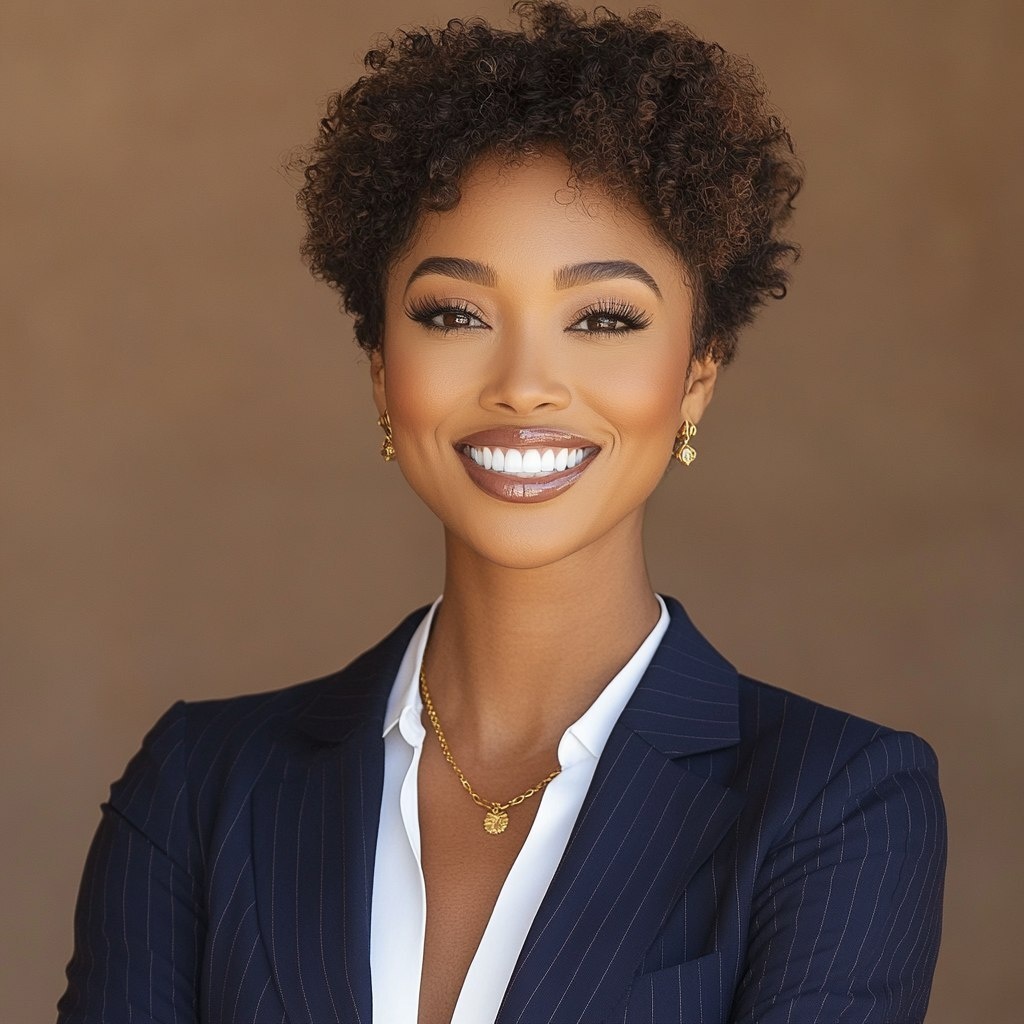 Создано на основе запроса: headshot of beautiful African American woman, wearing navy blue suit with white shirt and gold necklace , smiling