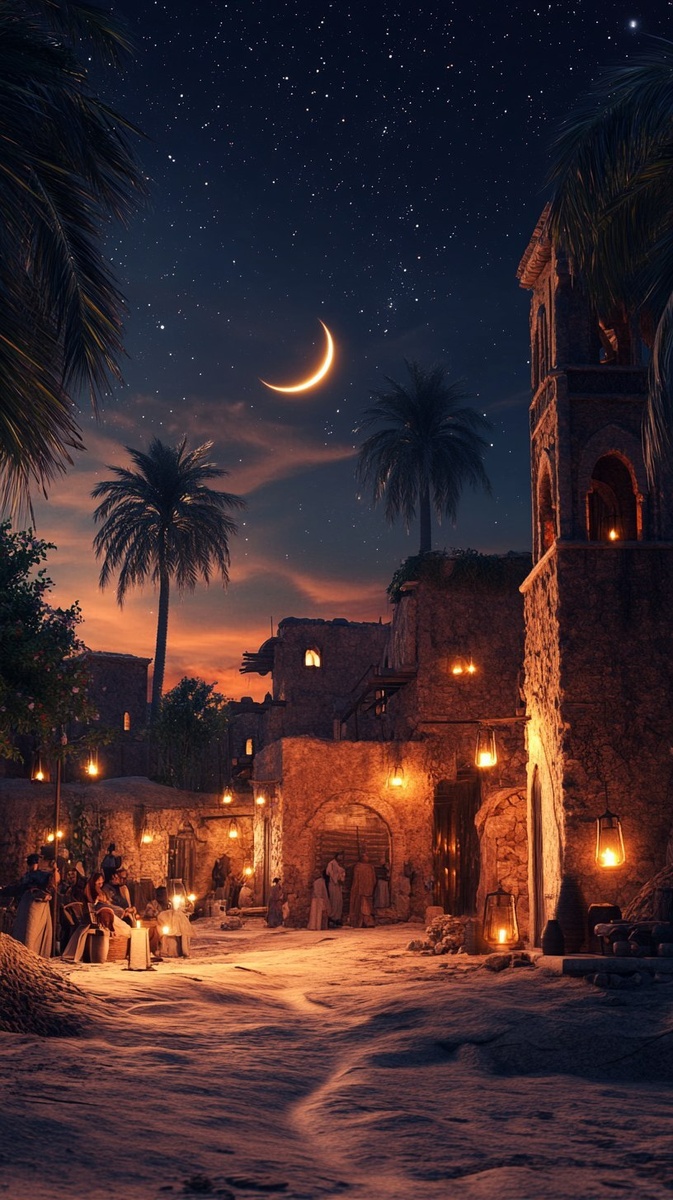 Создано на основе запроса: A hyper-realistic cinematic night scene of a 7th-century Hijaz village, mudbrick homes under a starlit sky, glowing oil lanterns, families gathered for final iftar of Ramadan, crescent moon rising in the background, warm atmospheric lighting, soft twilight shadows, ancient palm trees, early Islamic era mood