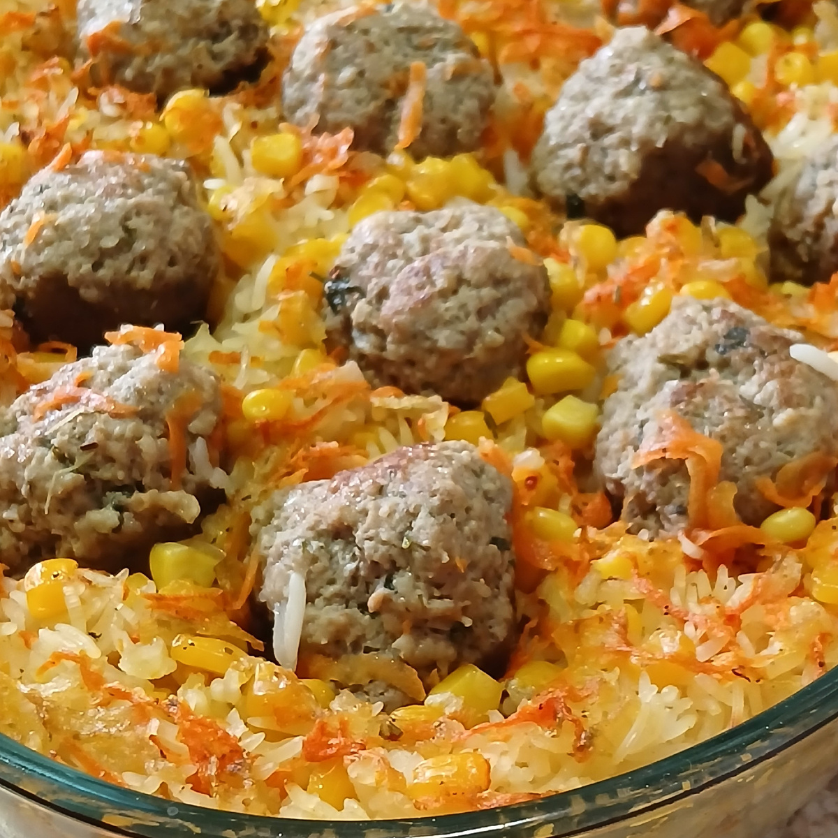 Ужин — это время, когда хочется насладиться вкусной и сытной едой, но при этом не тратить слишком много времени на готовку. Сегодня я хочу поделиться с вами рецептом, который идеально подходит для таких случаев: рис с овощами и фрикадельками, запечённый в духовке. Это блюдо сочетает в себе нежность риса, сладость пассерованных овощей и сочность мясных фрикаделек. Оно готовится просто, но получается невероятно ароматным и сытным. Идеально для семейного ужина или даже для встречи гостей! - Рис — 200 г - Лук репчатый — 1 шт. (средний) - Морковь — 1 шт. (средняя) - Консервированная кукуруза — 150 г - Фарш (говяжий или куриный) — 400 г - Яйцо — 1 шт. - Чеснок — 2 зубчика - Соль — по вкусу - Перец черный молотый — по вкусу - Паприка — 1 ч. л. - Растительное масло — 2 ст. л. - Вода или бульон — 400 мл - Зелень (петрушка или укроп) — для подачи 1. Подготовка риса: Рис промойте под холодной водой до прозрачности. Замочите его в воде на 15–20 минут, чтобы он быстрее приготовился. 2. Приготовлени