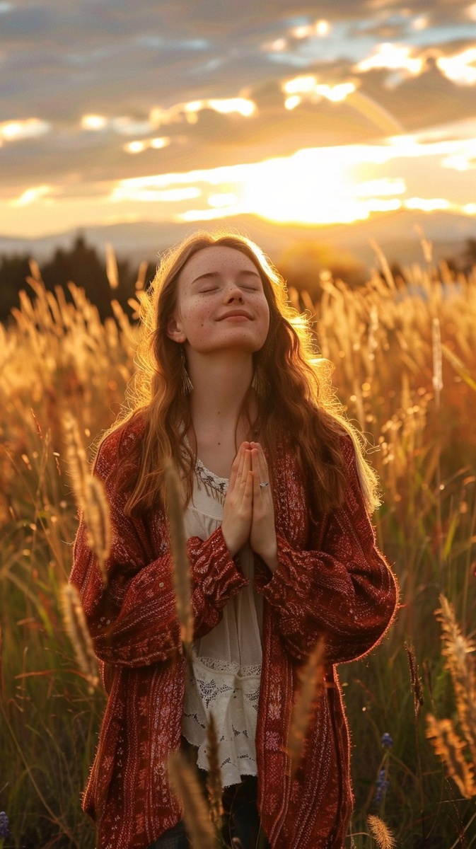 Создано на основе запроса: an adult girl praising God in the middle of a field at sunset