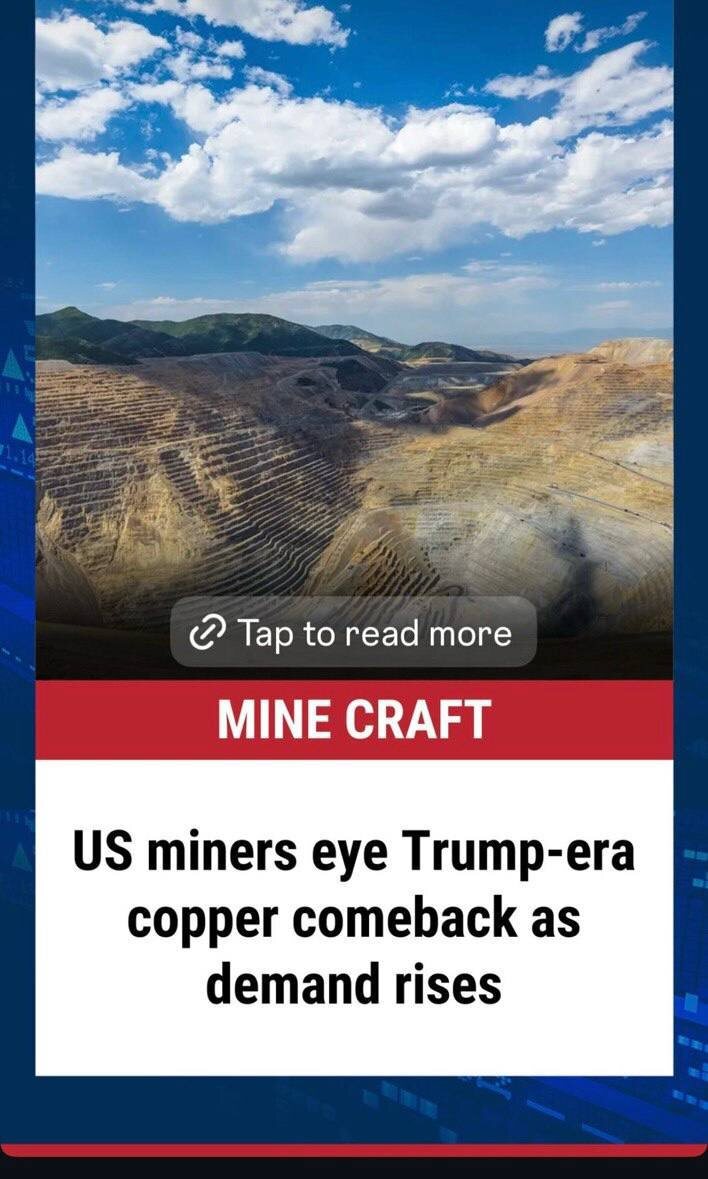 🔥 In 5 days we will find out more about the Copper One project in our call. Don't miss this event, we will give you lots of answers to your questions here. Until then, we will provide you with daily information on the topic of copper. Link 🔗 to the call in our new Nomo calendar! 📅 https://nomo.app/webon/events.nomo.zone ----------------- https://www.foxbusiness.com/markets/us-miners-eye-copper-comeback-demand-rises Clayton Walker, Chief Operating Officer of Rio Tinto's Copper Products Group, on the need for more copper mines and production in the U.S. 🇺🇸