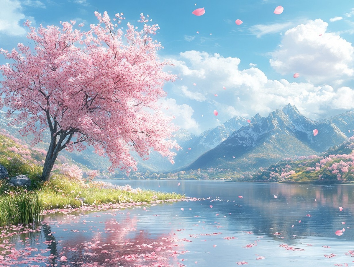 Создано на основе запроса: wide digital painting of a peaceful spring landscape featuring a distant blossoming cherry tree beside a calm reflective lake, pastel pink and white flowers on graceful branches, soft fresh grass and emerging leaves, sunlight filtering through a clear blue sky with scattered soft clouds, mountain ridges in the far background, petals gently floating on the water surface, tranquil mood of early spring renewal, ultra-sharp detail with soft painterly texture, no people --- Автоперевод: Широкая цифровая живопись мирного весеннего пейзажа с далеким цветущим вишневым деревом рядом с спокойным отражающим озером, пастельными розовыми и белыми цветами на изящных ветвях, мягкой свежей траве и новых листьях, солнечным свети Как тебе это изображение? 🤔 https://dzen.ru/id/65c0c65c86e4f837c27b24d7 #ИИ #AI #нейросеть #midjourney #art