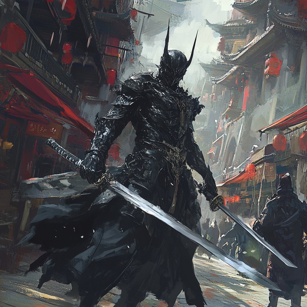 Создано на основе запроса: a black knight that fights with twin katanas in a market place