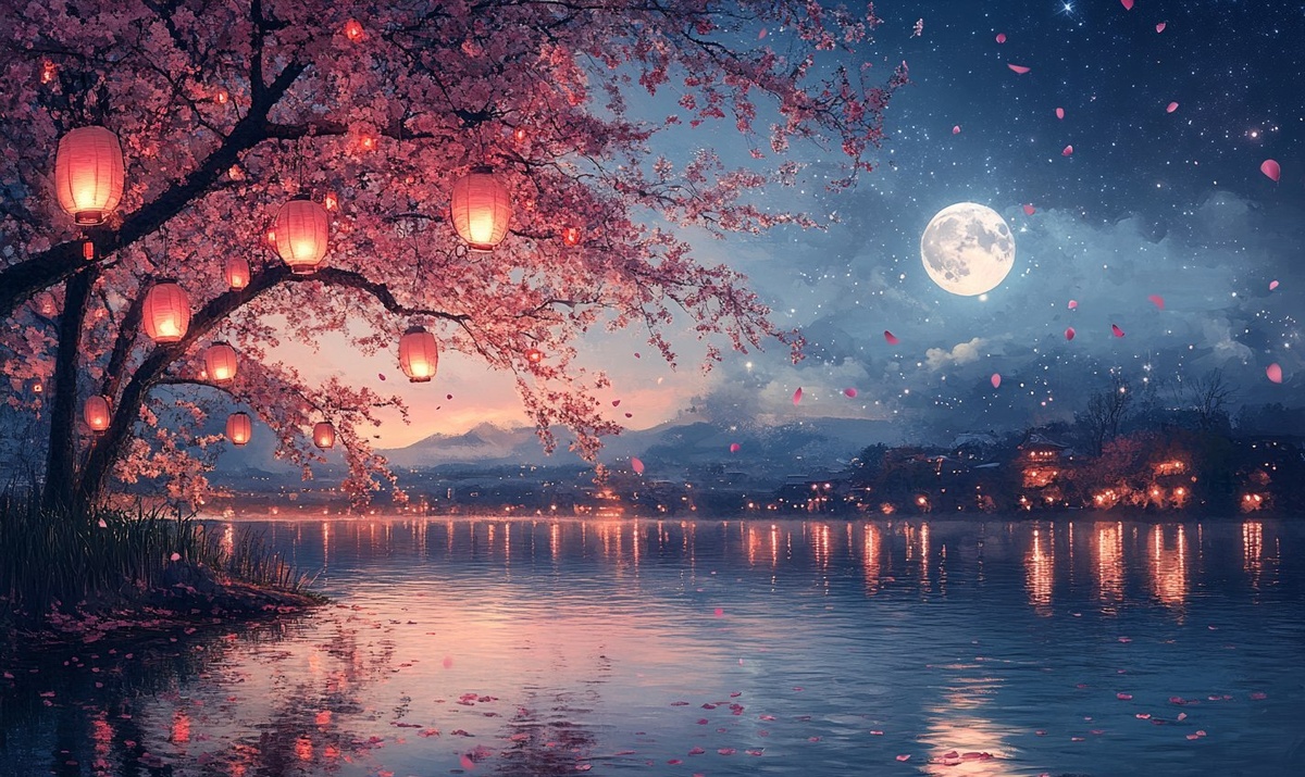 Создано на основе запроса: dreamy digital painting of a tranquil nighttime scene with a blossoming cherry tree beside a still lake, glowing paper lanterns softly hanging from branches and floating on the water, gentle reflections shimmering on the lake surface, star-filled night sky with a slightly larger full moon casting soft silvery light, delicate pink petals scattered around, calm blue and violet hues in the background, peaceful and magical atmosphere, ultra-sharp detail with soft painterly textures, no people
