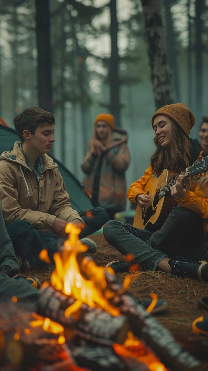 Создано на основе запроса: a group of young people camping, around a fire, singing, guitar playing, laughing, photo realistic
