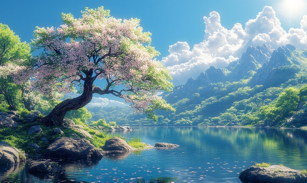 Создано на основе запроса: sharp focus ultra-detailed summer landscape in the style of Japanese art, a majestic cherry tree in full vibrant