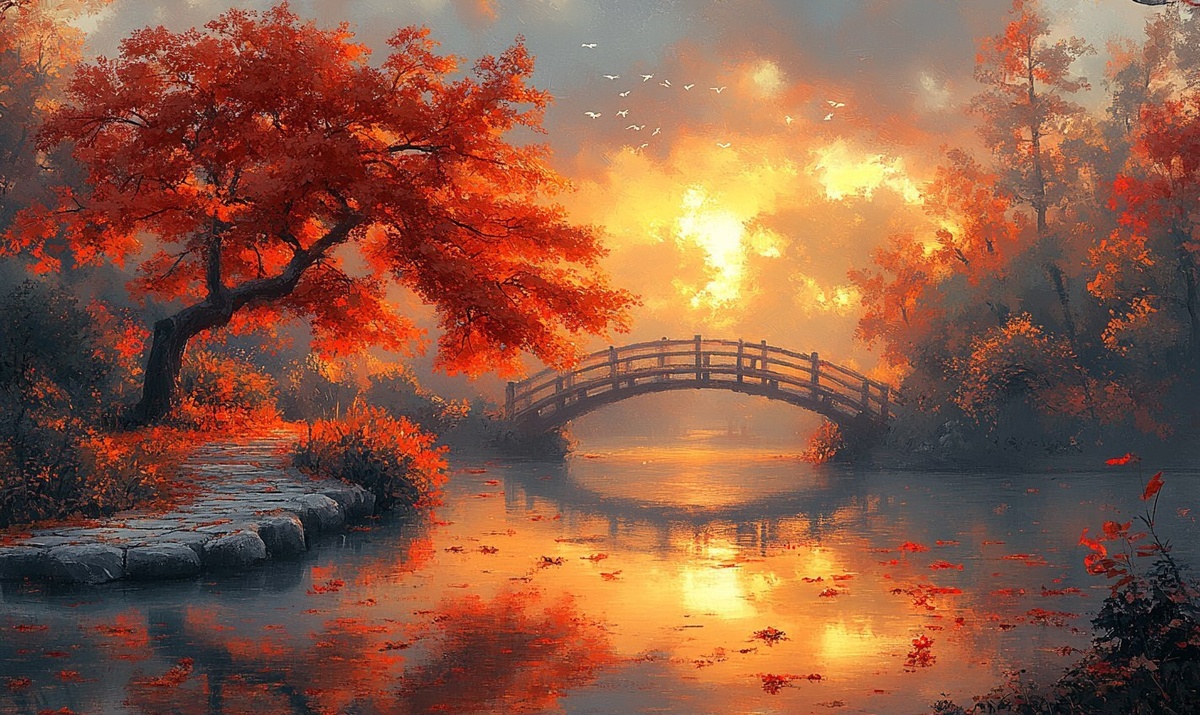 Создано на основе запроса: digitally painted autumn landscape in a Japanese-style garden, vivid painterly brushwork with rich orange and crimson foliage, a gracefully twisted maple tree leaning over a stone path, leading to a serene arched wooden bridge over a calm reflective pond, sunset sky glowing with golden-orange light mirrored in the water, scattered red leaves floating on the surface, soft atmospheric haze, tranquil mood, poetic serenity, painterly texture, warm natural light, ultra-clear composition, elegant digital painting