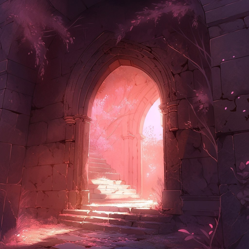 Создано на основе запроса: On a wall, an arch appears and a pinkish light emanates from it