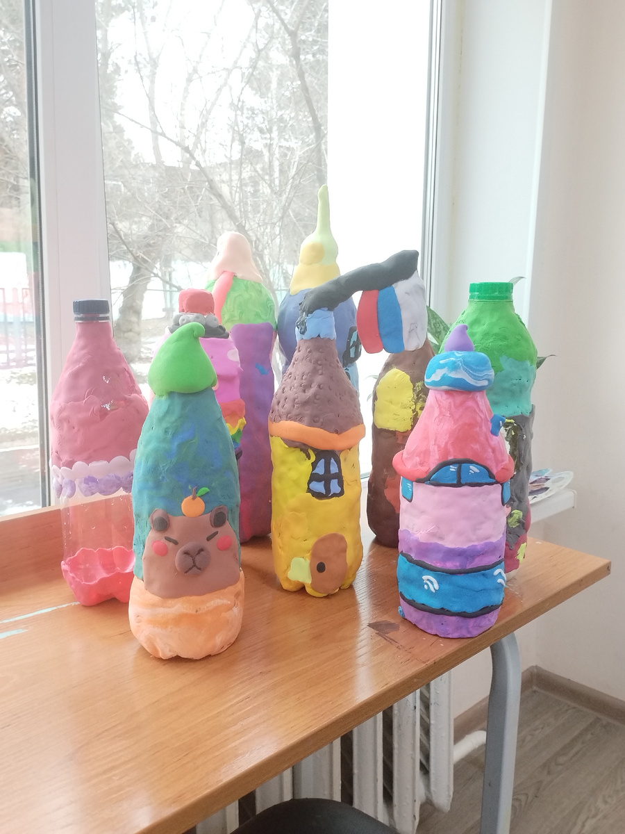 "Лепка волшебного городка из воздушного пластилина и пластиковых бутылок" На этом увлекательном уроке дети занимались лепкой, создавая чудесные домики для будущего городка. Они были полностью погружены в творческий процесс, наслаждаясь работой с воздушным пластилином и необычным дополнительным материалом — пластиковыми бутылками.