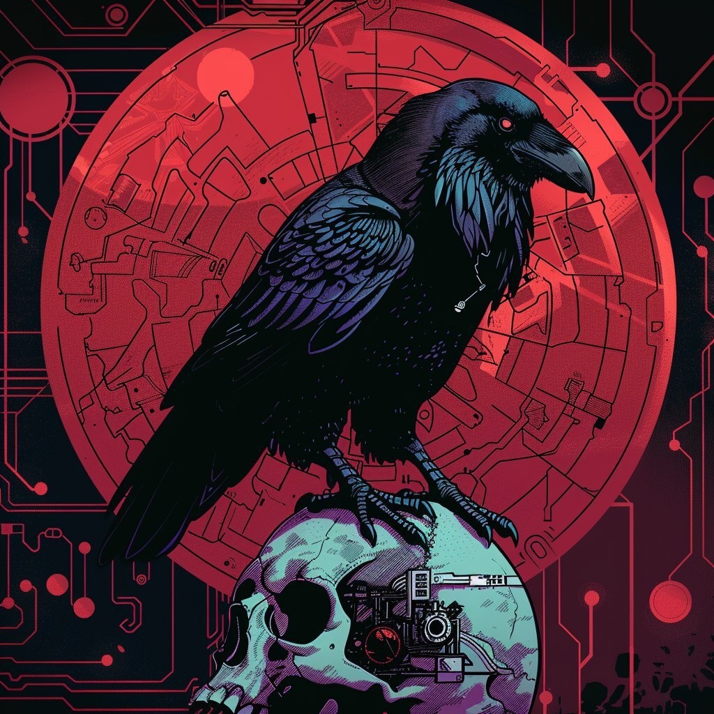 Создано на основе запроса: esoteric raven perched on a cybernetic skull, glowing circuitry, mystical runes in the background, dark occult