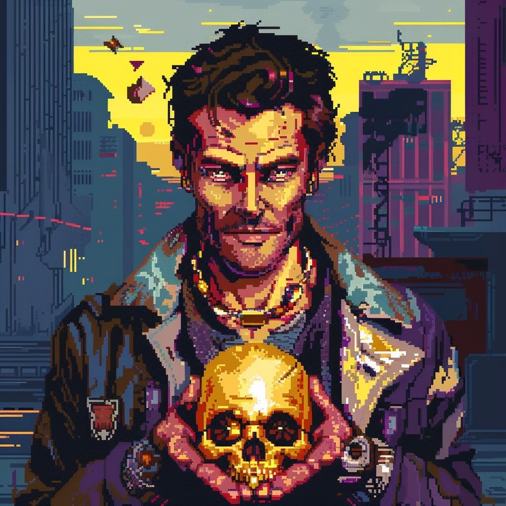 Создано на основе запроса: male pixel art character holding a golden skull, fun expression, cyberpunk background, stylized like retro RPG