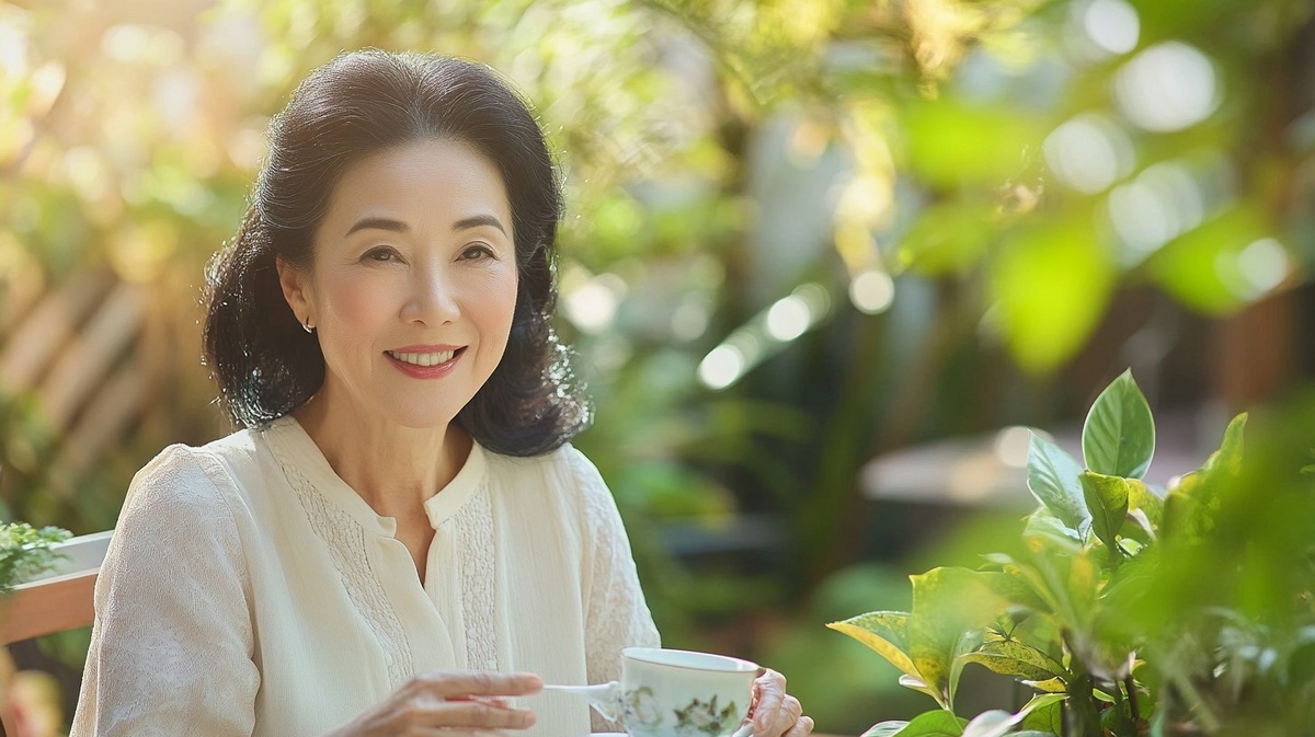 Создано на основе запроса: A 50-year-old Asian woman enjoying life with a sense of peace and security. She is smiling gently while tending to her garden or sipping tea on a sunny patio. Her appearance is graceful and relaxed, wearing comfortable yet elegant clothes. The background is warm and inviting, filled with soft light, greenery, and a calm atmosphere. Her posture and expression reflect contentment, wisdom, and a deep appreciation for the present moment.