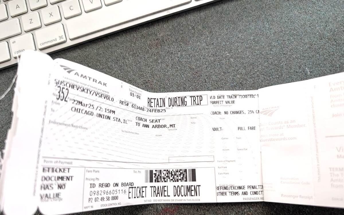 Опять задерживаемся из-за перекрытой дороги. Будет смешно опоздать второй раз по той же причине. Пока стоим в пробке, поезд переносят. Успеваем даже к оригинальному времени. Неумело хамлю хранителю врат, но на английском выходит куце. Отпускаю и ухожу ждать. 30 невнятных минут туда сюда и уже стоим в настоящей очереди, куда нас пригласили. Билет спросят только через час после отправления, а перед посадкой на поезде нас разделяют на анн Арбор и Детройт. Звучало, будто отцепят вагоны, но как потом объяснит А. на некоторых станциях очень короткие платформы, поэтому выйти можно только из соответствующего вагона.