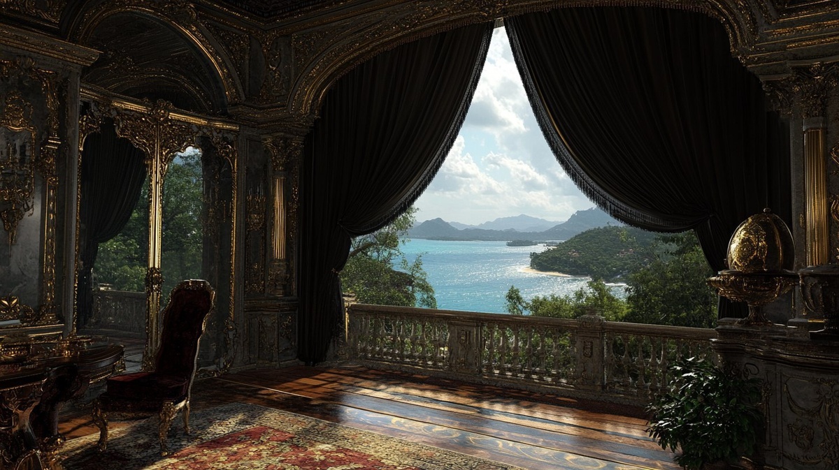 Создано на основе запроса: 8th century Old Brazillian Villa overlooking the Emerald Seas, Decorated by the Imperial Greek Family, Draped in the finest shimmering black drapes over the Balcony Opening, gesamtkunstwerk