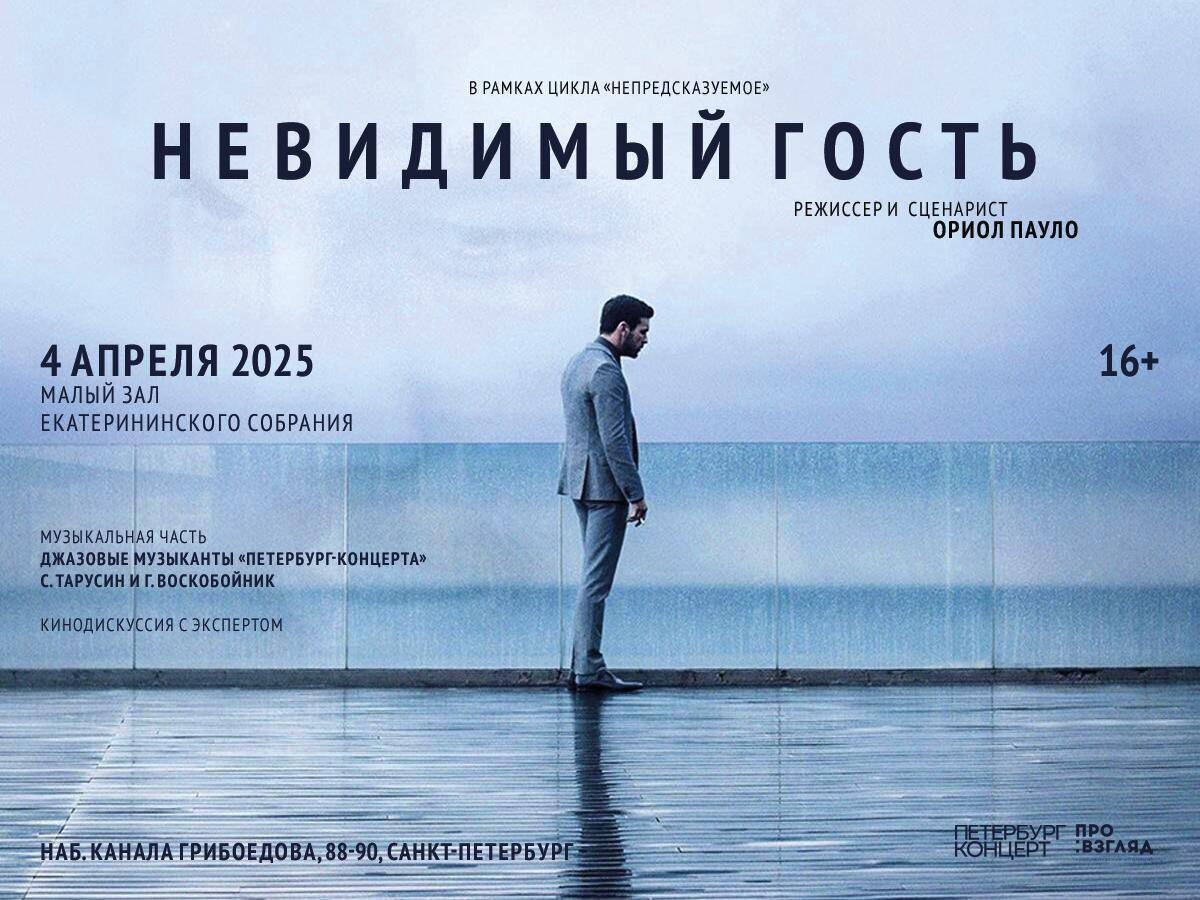 Друзья, приглашаем вас на наши увлекательные кинопоказы, сопровождаемые концертной программой и дискуссией о фильме! Это отличная возможность насладиться любимыми фильмами в компании единомышленников и открыть для себя новые шедевры киноискусства. 4 апреля в Малом зале Екатерининского собрания будет представлен психологический триллер «Невидимый гость» от мастера испанского хоррора Ориола Паоло (в русском дубляже). Интригующая история с выходом в прокат покорила кинолюбителей по всему миру и вошла в многочисленные подборки с лучшими представителями жанра. Концертную часть представят ведущие музыканты петербургской джазовой сцены Сергей Тарусин и Григорий Воскобойник с уникальной программой для погружения в атмосферу таинственного детектива. Выступление состоится перед началом показа. Завершит вечер увлекательная дискуссия, где зрители смогут поделиться впечатлениями о просмотренном кино, пообщаться и послушать мнение эксперта. Дата: 4 апреля, 19:00 Место: Екатерининское собрание При