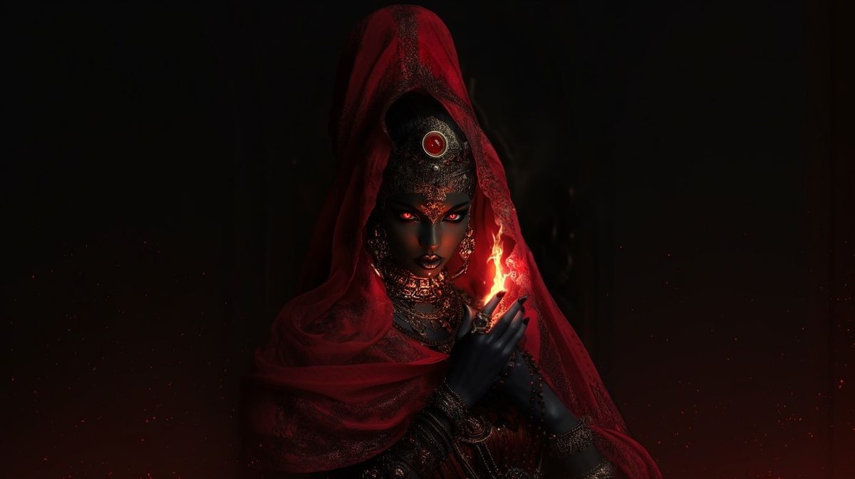 Создано на основе запроса: A dark goddess with an intricate, ornate headdress, glowing red and gold jewelry, and a flowing red veil