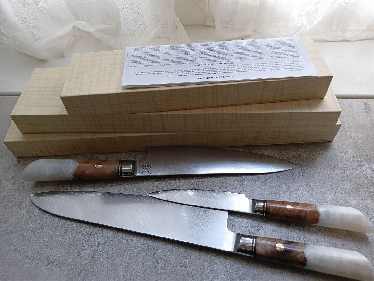 *"Сегодня получила свой заказ – ножи. Упаковка удивила: красивая, надежная, очень аккуратная и качественная. Открывала с благоговением… Ножи брала в руки очень нежно. Они великолепны! Сталь, ручки – просто изумительно красивы. Это не просто кухонные ножи, это произведение искусства!