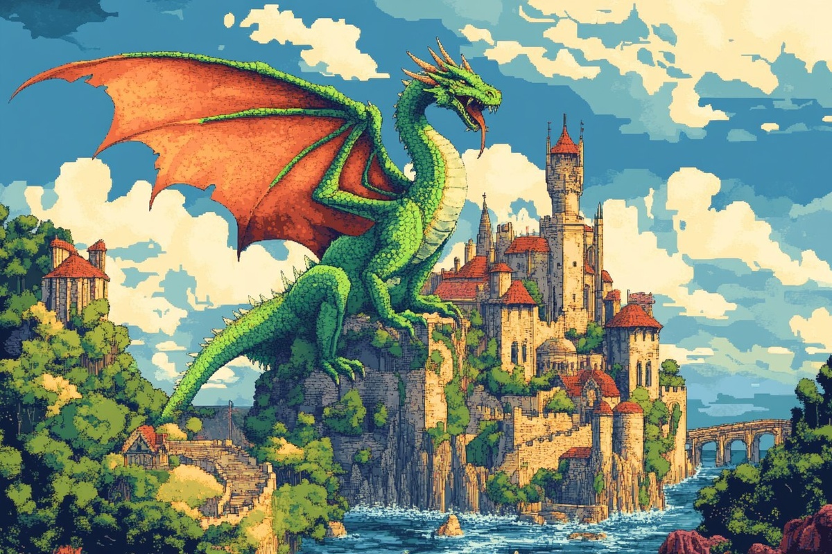 Создано на основе запроса: Illustration of RPG, Pixcel art, Dragon,RPG, Castle, planar, vivid color