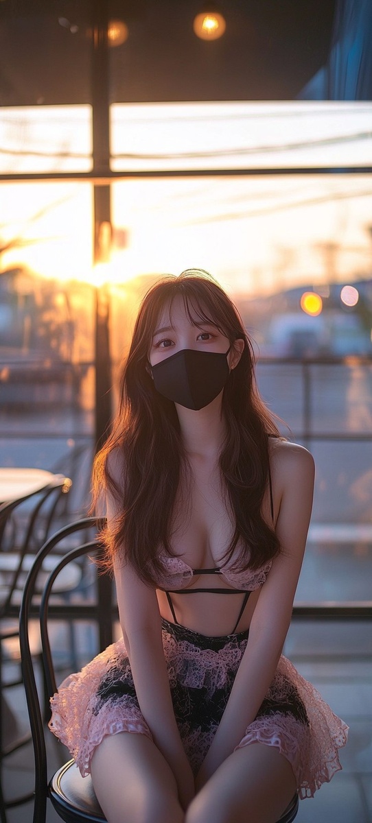 Создано на основе запроса: Japanese woman, popular Japanese idol, 18yo, beautiful long brown hair combed through, pretty plump figure, black mask, smiling, eye makeup, professional makeup artist, perfect eyes, knees, quads, black shorts, black and pink mini skirt dress with lots of frills, blue sky, sitting on a chair in a cafe, sunset shining from the coastline, triceps, quads, front shot, the blinding light of the midday sun, shot with a Canon EOS R5, highly,