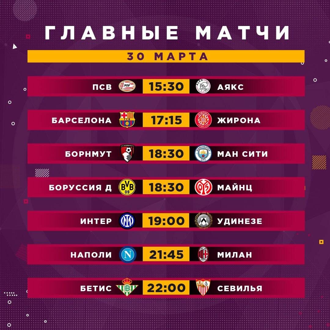 👇 Расписание матчей. Что смотрим? 🏴 Кубок Англии, 1/4 финала 15:30 Престон – Астон Вилла 18:30 Борнмут – Манчестер Сити 🇪🇸 Ла Лига 15:00 Хетафе – Вильярреал 17:15 Барселона – Жирона 19:30 Атлетик – Осасуна 19:30 Валенсия – Мальорка 22:00 Бетис – Севилья 🇮🇹 Серия А 13:30 Кальяри – Монца 16:00 Фиорентина – Аталанта 19:00 Интер – Удинезе 21:45 Наполи – Милан 🇩🇪 Бундеслига 16:30 Фрайбург – Унион Берлин 18:30 Боруссия Д – Майнц