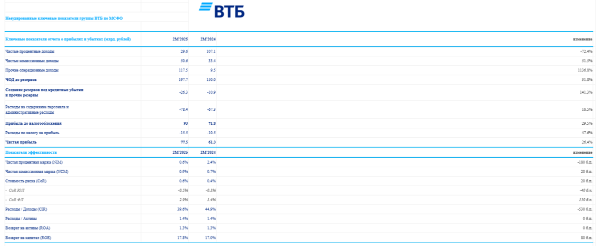 🏦 Банк ВТБ опубликовал финансовые результаты по МСФО за январь-февраль 2025 г. В данный период банк смог заработать увесистую сумму на прочих опер. доходах, попутно заплатив налог на прибыль по меньшей ставке, конечно, данные стать помогли увеличить чистую прибыль по отношению к 2024 г., но если рассматривать розничное кредитование и % доходы, то там не всё так гладко, поэтому прогноз по заработку на 2025 г. значительно снижен: ✔️ ЧПД: 29,6₽ млрд (-72,4% г/г) ✔️ ЧКД: 50,6₽ млрд (+51,5% г/г) ✔️ ЧП: 77,5₽ млрд (+26,4% г/г) 💬 Показатель чистой % маржи упал за 2 месяца на 180 б.п. до 0,6%, банку обошлось в копеечку привлечение денег клиентов (можно, конечно, учитывать праздничные и короткий февраль, но год назад она была 2,4%). 💬 Комиссионные доходы продемонстрировали внушительный рост благодаря позитивному эффекту от форексных транзакций и транзакционных комиссий, связанных с обслуживанием трансграничных платежей (учитывайте санкции на ГПБ). 💬 Кредитный портфель юридических лиц увелич