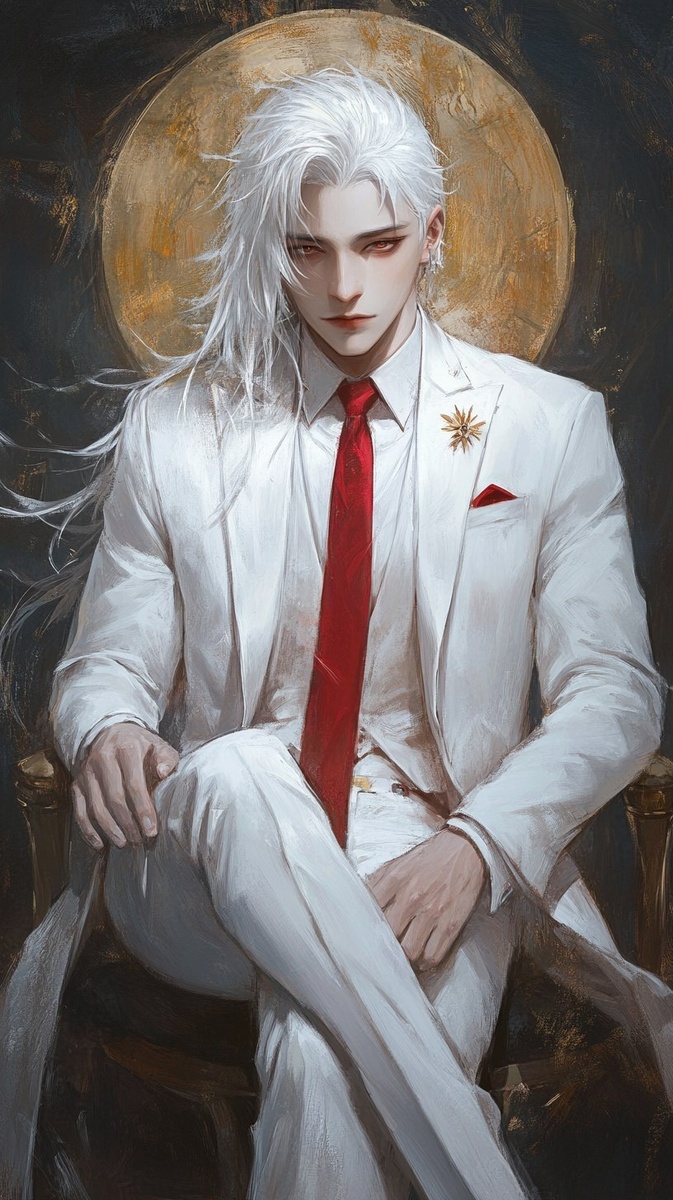 Создано на основе запроса: Generate a painting for Lu Su, code named Yuan, requesting him to wear a white suit and a red tie without a crown, with medium to long hair, and to create a male youth with silver white hair and a business atmosphere