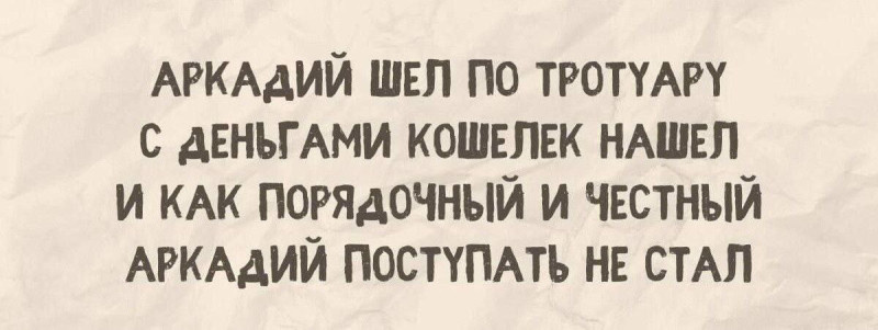 С утра за окном ясно, сухо и почти около нуля. Но кого из опытных дачников такое остановит! Вон, понемногу тянутся на автобусную остановку. Впрочем, я и сам сегодня собираюсь прокатиться до участка. Вот только выпью чашку кофе и поделюсь с вами находками этой недели. *** ты дважды мне дарил конфеты однажды красную икру и вдруг букет я чуть не плачу но жру © YanaKrilova *** подумаешь убил олега а как же эти сорок лет когда не убивал не грабил они по вашему не в счёт © tolegor *** во сне пришла ко мне цыганка я дал будильник ей украсть © Мишачок *** на третий год семейной жизни сдала у мужа на права теперь по чётным и в субботу права © metafola *** в клуб анонимных анонимов звонил сегодня аноним они ему дышали в трубку он им © журкова *** олег боролся с алкоголем но алкоголь не дурачок то с макаронами по флотски проникнет внутрь то с холодцом © Неусита *** врачи пересадили глеба из скорой на асфальт шоссе и с криком мы его теряем умчались в ноч под вой сирен © ethopmevoila *** глеб обна