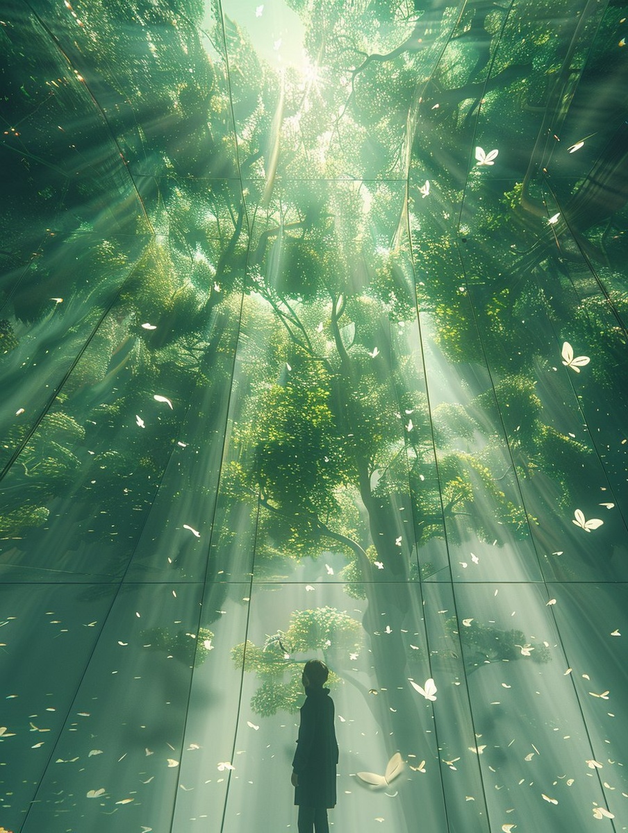 Создано на основе запроса: Low-ceiling white space, a full-length figure (40% frame height) interacts with a vibrant emerald-green tree scaled to human proportions. Translucent butterflies/fish orbit chest-level through sunbeams from overhead skylights, casting leaf-shaped chromatic shadows. Foreground-focused composition with shallow depth of field. --- Автоперевод: Белое пространство с низким потолоком, фигура полноразмерного (высота 40%) взаимодействует с ярким изумрудно-зеленым деревом, масштабированным до пропорций человека. Как тебе такая картинка? 🤔 https://dzen.ru/id/65c0c65c86e4f837c27b24d7 #ИИ #AI #нейросеть #midjourney #art