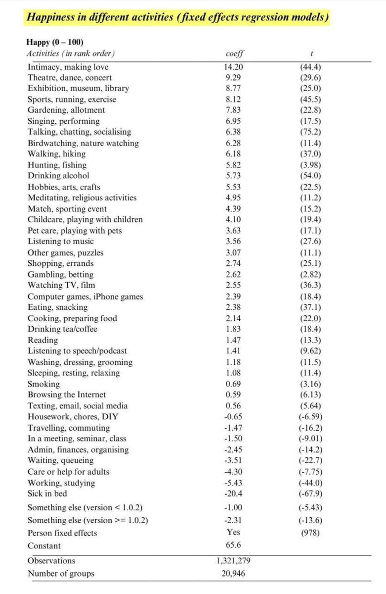 Что делает нас счастливыми на самом деле? На основе данных от 20 000 пользователей iOS-приложения Mappiness, которые ежедневно фиксировали уровень своего счастья, выкатил вот такую табличку. Я заботливо вам ее перевела на русский🥄 И выводы, кстати, очень даже крутые, интуитивно люди понимают что им нужно на самом деле. Особенно когда их просят осознавать и отмечать в приложении)))) Но если опереться на эти данные и привить себе привычки, то у счастья не такая уж и сложная формула. 🔴Любовь - № 1 Близость и занятия любовью на первой строчке с внушительным отрывом. А я вам все время говорю, одиночество - беда нашего времени, люди кукухой едут, не заигрывайтесь в тренды «антиблизости» 🔴Искусство наше всё Театр, танцы концерты, выставки, музеи, библиотеки - искусство ка котдельная статья расходов - классное решение. 🔴Спорт, бег, упражнения, активность на даче Тут вообще все понятно, адреналин, серотонин, дофамин делают свое дело качественно. Советский человек счастливым на даче