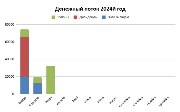 Всех приветствую, Прошел март, можно подводить итоги по денежному потоку. Март уже веселее "грустного" февраля, который дал только 19070 рублей. В Марте портфель дал - 32368 рублей денежного потока. Напомню как я все это считаю: Дивиденды, купоны по основному портфелю (ИИС и Домик у Моря сюда не входят). Так же сюда относятся проценты (после закрытия вклада) по тем вкладам что я для себя считаю в капитале, а не подушке безопасности. Дивиденды и купоны считаются уже "чистыми" после вычета НДФЛ. Дивиденды: 0 рублей. Купоны по облигациям: 32 268 рублей. Тут и выплаты по ОФЗ и выплаты по замащайкам Газпрома. Проценты по вкладам: 0 Весь полученный доход, как и весь предыдущий год, был реинвестирован обратно и продолжает работать на меня. В Апреле точно будет 50+ за счет вкладов ну и возможно какая-то мелочь по облигациям. Ну а с мая начнется дивидендный сезон и поток из ручейка станет потоком :) С начала года средне месячный доход составляет 41,9 тысяч рублей.