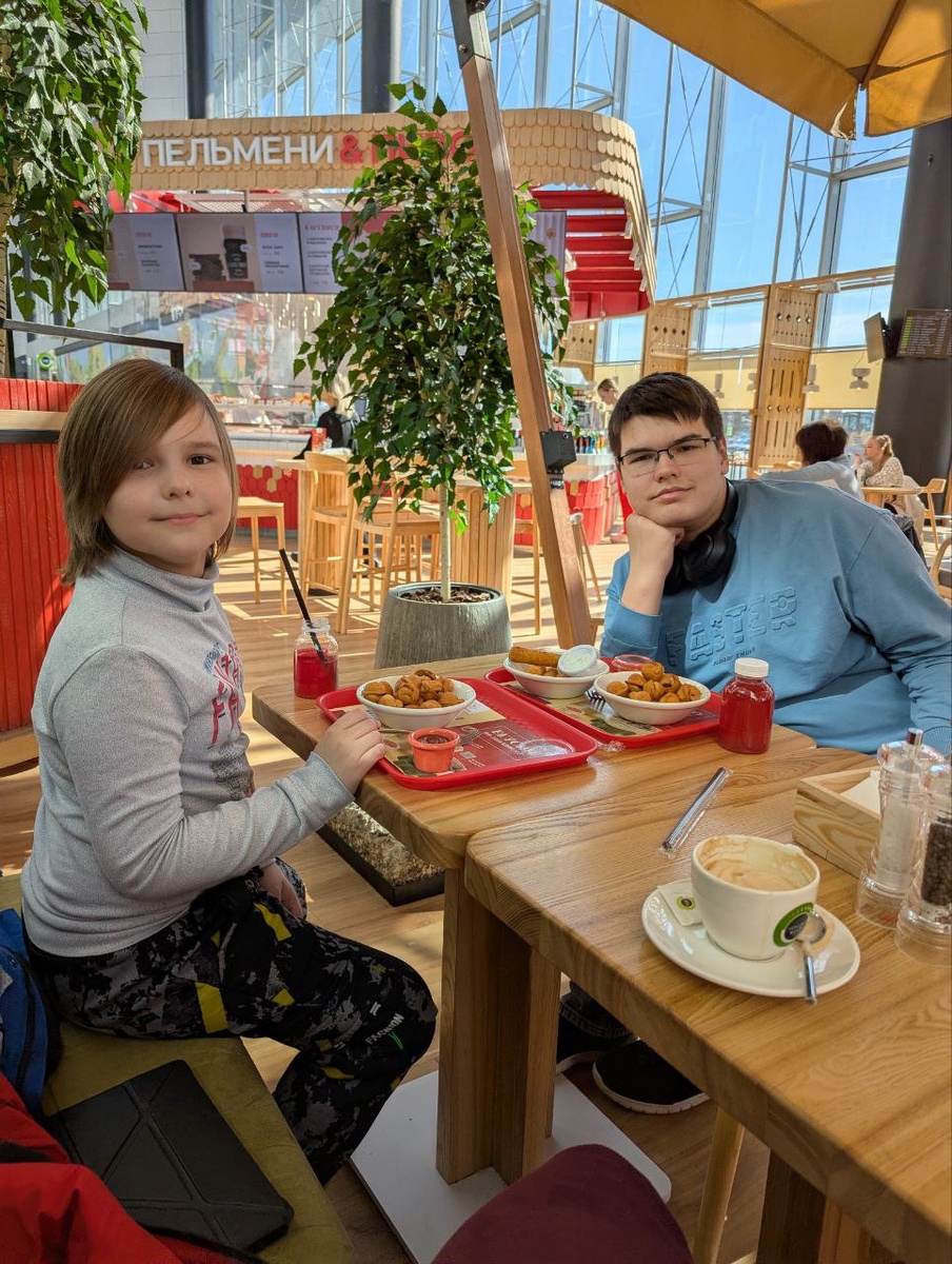 СПб 2025. А по Пельменям? Удивительная способность моих детей заключается в их нюхе, который безошибочно ведёт туда, где пахнет пельменями. Вот и здесь, только рукав самолёта оказался за спиной, дети взяли след и вывели точно на Пельменную. Очень интересное оформление. В качестве декора используются скалки, кухонная утварь, искусственная растительность, над головой летает синичка. Рядом с каждым столиком розетки. Открытый цех, где готовят пельмени, вареники, салаты. Дети оценили стенд, где были приклеены пельмени и вареники разных видов. Цены, естественно, как в аэропорту. За 2 порции пельменей во фритюре, 1 порцию(4 кусочка) жаренного сыра, 2 бутылочки по 0.25 брусничного морса и чашку капучино, с моей карты улетело 3800 рублей. А отпуск только начался. Детям смеюсь, чтобы с самолете наедались плотно, чтобы хватило до завтра. На сегодня лимит исчерпан. ☺️