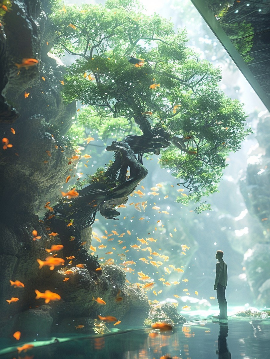 Создано на основе запроса: In a height-limited white space, an emerald-green vine-like tree ascends the left wall occupying 1/3 frame width. A full-body figure (35% frame height) stands on the right, with translucent butterflies/fish forming a luminous band between human and tree. Precise skylight beams highlight bark textures, while bokeh blur softens the right space to emphasize subjects. --- Автоперевод: В белом пространстве, ограниченном высотой, дерево изумрудно-зеленой виноградной лозы поднимается на левую стенку, занимая 1/3 ширины кадра. Отлично получилось? 🤔 https://dzen.ru/id/65c0c65c86e4f837c27b24d7 #ИИ #AI #нейросеть #midjourney #art