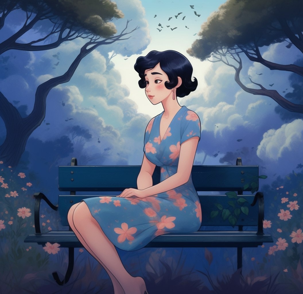 Создано на основе запроса: A beautiful woman sitting on a bench, wearing a royal blue floral off-shoulder dress, with short black hair, in the style of Ghibli and Loish and in the style of kawaii animation. A blue tree is in the background, with clouds in the sky, resembling an album cover art. --- Автоперевод: Красивая женщина, сидящая на скамейке, одетый в королевское голубое цветочное платье с плечами, с короткими черными волосами, в стиле Ghibli и Loish и в стиле анимации Kawaii. Как тебе такой вариант? 🤔 https://dzen.ru/id/65c0c65c86e4f837c27b24d7 #ИИ #AI #нейросеть #midjourney #art