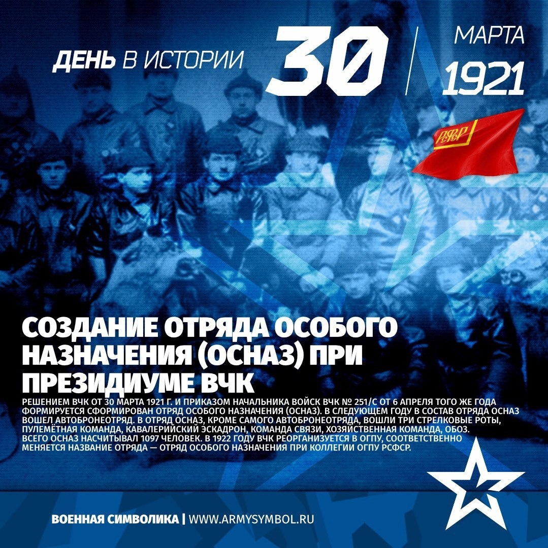 Создание отряда особого назначения (ОСНАЗ) при Президиуме ВЧК в 1921 Решением ВЧК от 30 марта 1921 г. и приказом начальника войск ВЧК № 251/с от 6 апреля того же года формируется сформирован Отряд особого назначения (ОСНАЗ). В следующем году в состав Отряда ОСНАЗ вошел автобронеотряд. В отряд ОСНАЗ, кроме самого автобронеотряда, вошли три стрелковые роты, пулемётная команда, кавалерийский эскадрон, команда связи, хозяйственная команда, обоз. Всего ОСНАЗ насчитывал 1097 человек. В 1922 году ВЧК реорганизуется в ОГПУ, соответственно меняется название отряда — Отряд особого назначения при Коллегии ОГПУ РСФСР. 17 июня 1924 года на базе отряда ОСНАЗ была создана Дивизия особого назначения (ДОН) при Коллегии ОГПУ СССР. #ПамятныеДатыВоеннойИсторииОтечества #ДеньВИстории #ГодЗащитникаОтечества #80ЛетВеликойПобеды Источник: https://vk.com/wall-60767131_30261 Подпишитесь на наши группы ВКонтакте и в Одноклассниках - читайте, смотрите и комментируйте! Источник