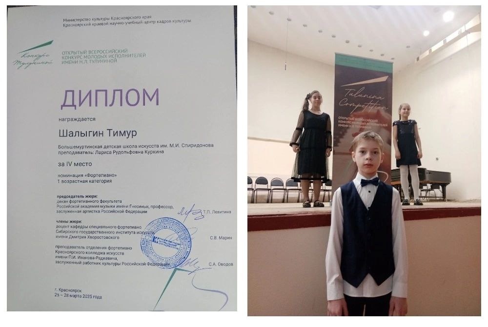 С 25 по 28 марта 2025 года в Красноярске прошёл Открытый Всероссийский конкурс молодых исполнителей имени Надежды Тулуниной. Почти 500 участников из разных уголков страны: Красноярск, Москва, Новосибирск, Абакан, Югра и других городов соревновались между собой, чтобы получить звание лучшего. Большая Мурта не осталась в стороне от масштабного события: на столь значимом конкурсе выступил ученик Большемуртинской детской школы искусств по классу фортепиано Шалыгин Тимур, который четвёртый год занимается под руководством преподавателя Ларисы Рудольфовны Куркиной. На счету Тимура немало побед, но по степени сложности и уровню конкуренции этот конкурс был особенным: в возрастной категории Тимура (10-12 лет) состязались 45 человек. В сложнейшей борьбе Тимуру досталось звание Дипломанта конкурса и IV место. Поздравляем юного пианиста и его преподавателя с достойным участием и желаем дальнейших успехов и творческого вдохновения Источик: МБУДО "Большемуртинская ДШИ"